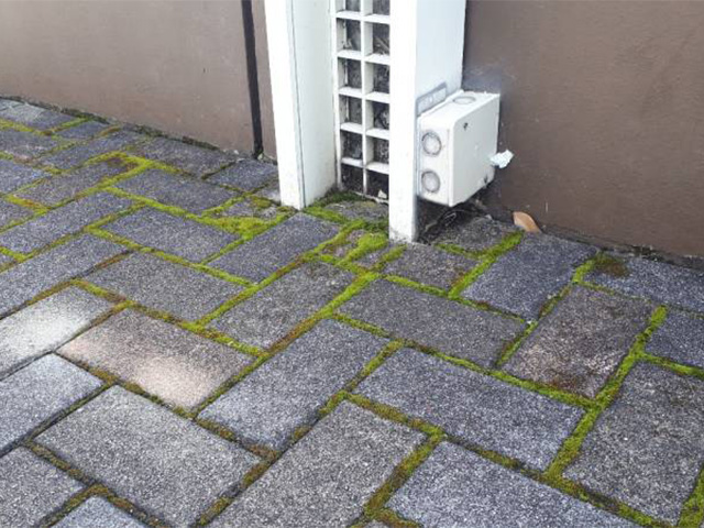 2026.02.20 清掃内容:インターロッキング高圧洗浄(コケ清掃) 所在地:富士市 清掃概要:マンション敷地内通路洗浄